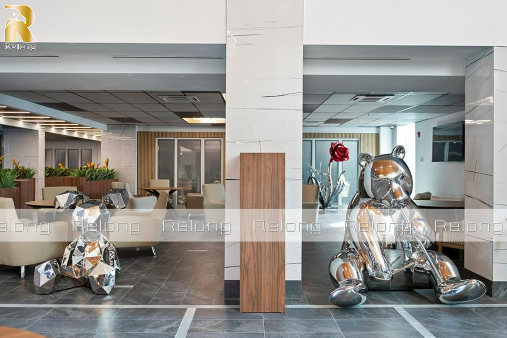 One of our clients in the United States purchased a collection of stainless steel sculptures to decorate his hotel. Among his selections were a geometric bear and a panda sculpture, both placed in the hotel lobby. He also shared photos with us showing how well the sculptures complement the interior design. If you’d like to explore more sculptures from this hotel project, please feel free to check them out “Stainless Steel Sculpture Project for a Luxury Hotel in Orlando, Florida“.
