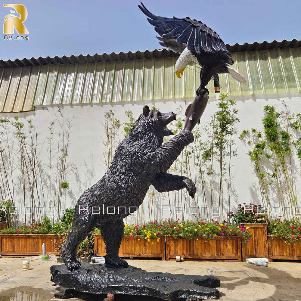 This bear and eagle statue is carefully designed to capture the dramatic pose of two fierce wild animals fighting for a fish. The interaction between the bear and the eagle reflects the natural balance of power and survival. We created lots of powerful bronze animal sculptures. The large bear and eagle statue could instantly draw attention, making it an ideal landmark sculpture. This sculpture could be used for parks, gardens, resorts, and private estates.
